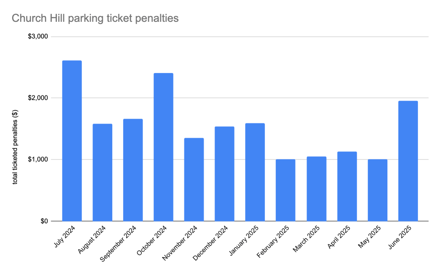 These data are sourced from SP Plus and the Richmond Police Department; as Ifatusin outlined, both parties issue tickets in the city. The reporting period is July 1st, 2024 to June 30th, 2025—one calendar year. In that period, drivers paid $18,905 in parking-ticket penalties. Here’s how it broke out on a monthly basis: