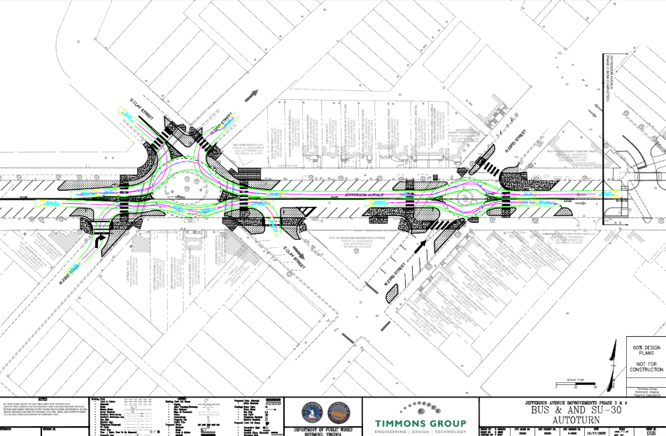The Department of Public Works (DPW) recently published the next iteration of its long-awaited plan to redesign the rest of Jefferson Ave. Recall, Phases 1 and 2 are now complete; the work still outstanding is slated to take place on the three-block stretch of the artery between E. Marshall and E. Leigh Sts. The new 18-page document, drawn up by the city’s contractor, The Timmons Group, and known as a 60% plan, includes more detail on how exactly DPW aims to improve the corridor. Check it out in the The Lookout’s share drive to see overlays showing accommodations for bus and firetruck turning radii, proposed curb and divider structuring, gutter-pan compositions, and more.