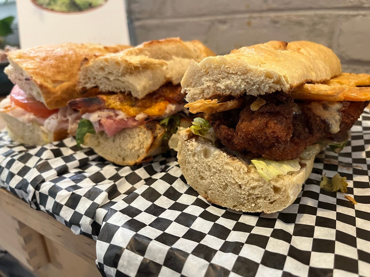 As I noted earlier this month, the renovation made way for two window-length counters, with stools to dine in. We got to go, and from placing our order to being handed the bag, the process took about 15min. The sandwiches aren’t unmanageably big, but they’re substantial. “MADE TO FEED - THEY’RE HEFTY,” the menu says. I’m hefty, too, so I ate half of both The Chicken Caesar and The Club halves (so, two quarters, or one total half, to complicate the math) for lunch Thursday, but most people could easily get two lunches out of one Chimbo half. Of the two I tried, The Chicken Caesar was the clear standout with its expertly fried cutlet complemented by the crunch of the parm wafer. The Club was solid, and I’d get it again. My wife built the BYO, and found herself adding some oregano from home to get it where it needed to be flavor-wise, but that’s more a calibration issue than a kitchen deficiency. The house baguette is serviceable, but a bit denser than a typical open-crumb French loaf, and with a less sturdy crust.