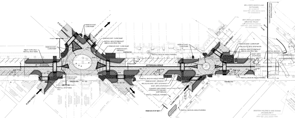 “We think we’re doing great overall,” he said, characterizing CFSJA’s first-blush reaction to the to the documents, which earmark the westernmost blocks of the avenue for similar makeovers as those you can already see between Union Market and Sub Rosa’s currently (but not permanently!) idled building at the intersection with N. 25th and M Sts. Phase 3 in particular will reduce the width of every crosswalk across Jefferson Ave. and each of the involved feeder streets: N. 22nd & 23rd Sts., as well as E. Clay St. As sketched (remember, this is all very much in a draft state), N. 23rd would also become one-way northbound, and the north and south sides of Jefferson Ave. adjacent to Triangle Park would get angled back-in parking.