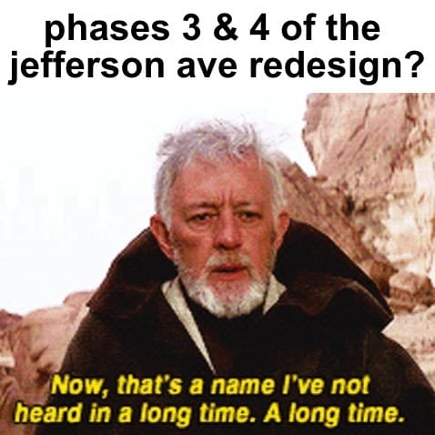 The schematics, prepared for the city by the Timmons Group (which laid out the previous redesign phases as well), are so-called “30%” plans: broad-stroke looks at how the city’s Department of Public Works (DPW) will finish the job on Jefferson Ave. You can check them out in full on The Lookout’s share drive. As you can see from the excerpted portion above, they’re far from final, and they only offer limited detail on Phases 3 and 4, the former of which is scheduled to begin in summer 2026. (“Fingers crossed,” Fendley was sure to add.) But with plenty of experience reading draft proposals for overhauling the thoroughfare over the years, the neighborhood advocate likes what he sees.